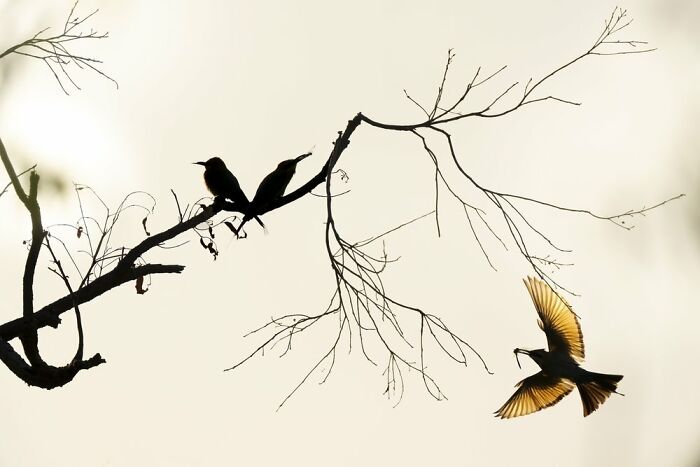 “A small group of Rainbow Bee-eaters were using this branch as a perch to launch feeding sorties. Their target was dragonflies, and two of the birds in this image can be seen with prey in their bills. Rainbow Bee-eaters make attractive backlit subjects because of their elegant lines and transparent flight feathers. In this instance, I felt the silhouetted subjects and delicate finger-like twigs combine nicely to present an image that offers a similar style to a Chinese painting.”