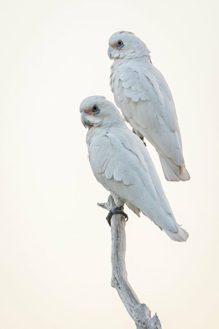 “Walking back to the car along the Coodanup Foreshore, I came across a large flock of what I believe were Little Corellas. They were feeding on the ground around the car park. I saw these two perched together on an open branch and thought it would make a cute photo. I composed the image in portrait orientation and chose to overexpose the image to get a nice, clean, white background.”
