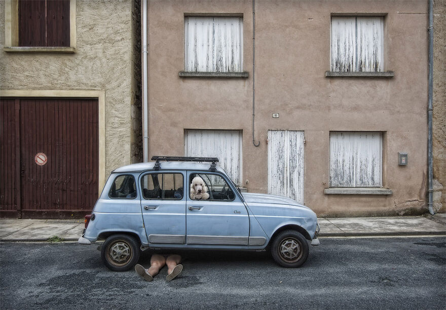 The car was apparently broken because there is someone underneath. But it’s not clear what she is doing. The woman is perhaps trying to repair the car but her dog is still waiting and less confident in it.