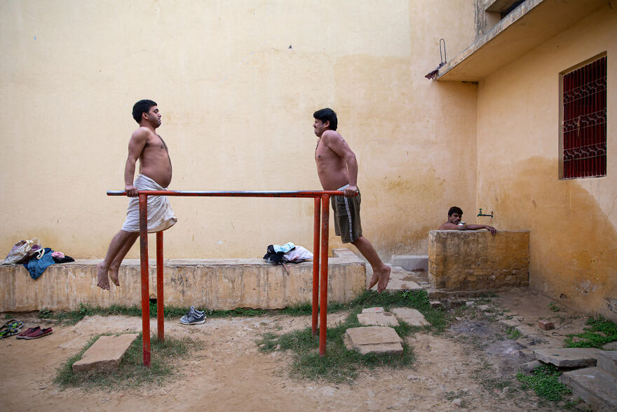 People are resting inside the train that will bring them from New Delhi to Jaipur. For a few hours, the wagon becomes their home. Some of them are resting on the seats and seem immersed in their thoughts, some brush their teeth, shave or prepare food.