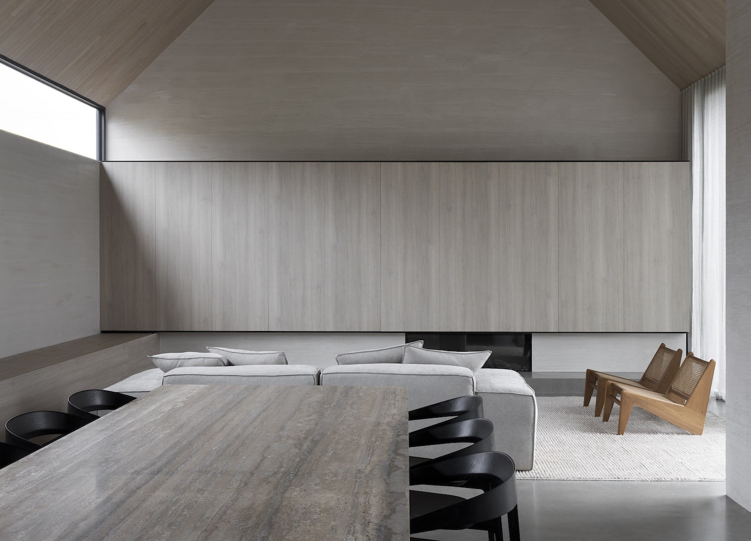The brief from the client was to create a home that embodied the relaxed, coastal lifestyle of Barwon Heads, and the renovation needed to allow for entertaining and to maintain a strong connection between inside and outside, and old and new. The home’s interior balances itself through the careful use of textural tones and contrasting materials. Architectural highlights include charcoal floorboards, oakwood-lined ceilings, slabs of silver travertine on the walls, and a large travertine island bench; a statement piece that doubles as a refined dining table. The mezzanine bedroom overlooks the living space below, with a modern bathroom finished in the same textured marble that appears in other parts of the home, like the kitchen splashback. Other furnishings like sheer linen curtains, a plush gray sofa, and minimalist black dining chairs, softly balance the space, creating comfort and a sense of homeliness.