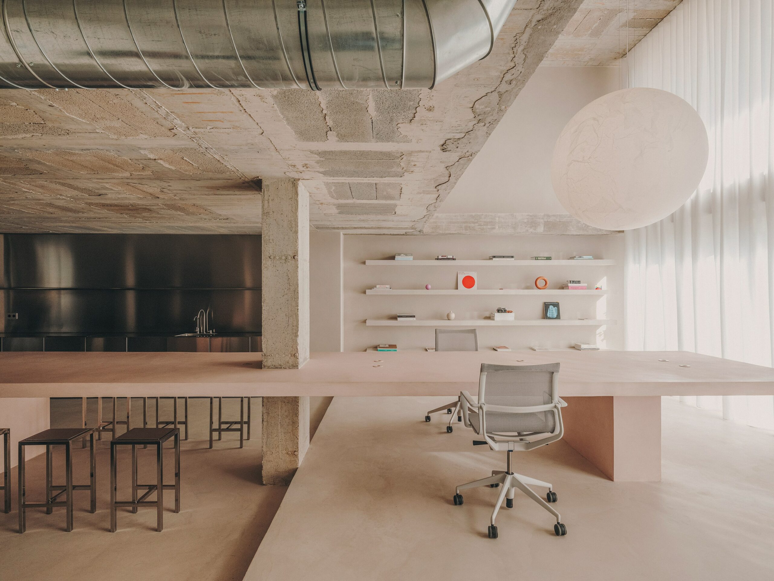 On the ground floor, a long concrete table built on site and attached to a structural pillar is intended for working and dining. It is the undiscussed visual centerpiece of the otherwise monochromatic office, painted in a subtle hue between millennial pink and beige. Metal stools surround the table, while a spherical lamp with a 120cm diameter—the ‘Moon’ design by Davide Groppi’—hangs above it, instilling an immediate feeling of calm and serenity in the room. Upstairs, in Reisinger’s private office, a large wooden desk with Cassina’s LC7 chairs by Charlotte Perriand transforms the workspace into an occasional meeting room. Around it, plush pink seating adds a touch of warmth to the workspace, subtly evoking the designer’s years-long fascination with the color pink. Overall, the space was designed to constantly inspire Reisinger’s work rather than distract him from it. Throughout, a curated selection of his designs sits alongside iconic furniture pieces, including the physical edition of Reisinger’s own popular ‘Hortensia Chair’, Miles van der Rohe’s ‘MR Lounge Chairs’, and red ‘Toio’ floor lamps by FLOS. Outside, a large rear terrace completes the project, functioning as a zen space beautifully curated with sitting areas and various plants.