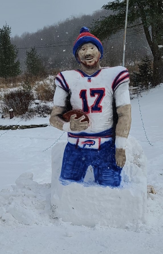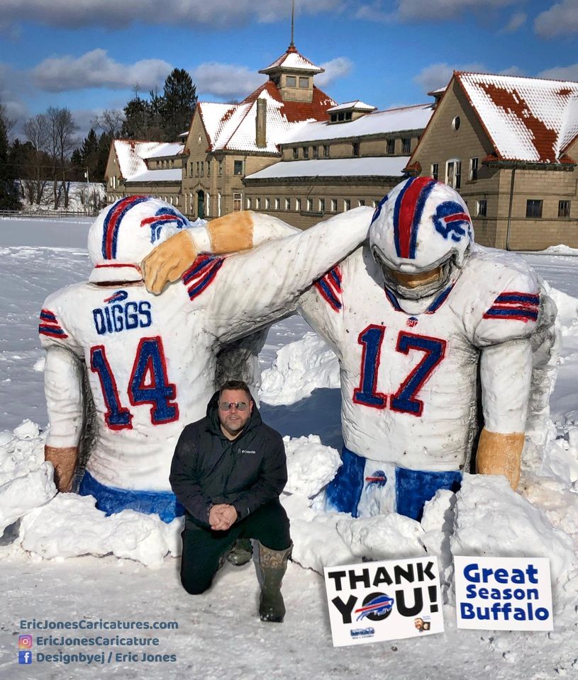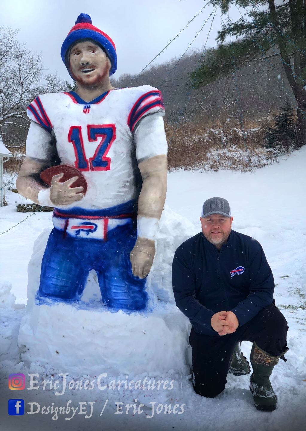 This is not the very first snow sculpture honoring the Bills and their amazing year. Ahead of the AFC Championship match, Jones built an 8 foot Josh Allen in his lawn, from only snow and spray paint.