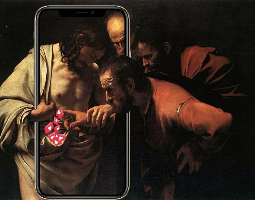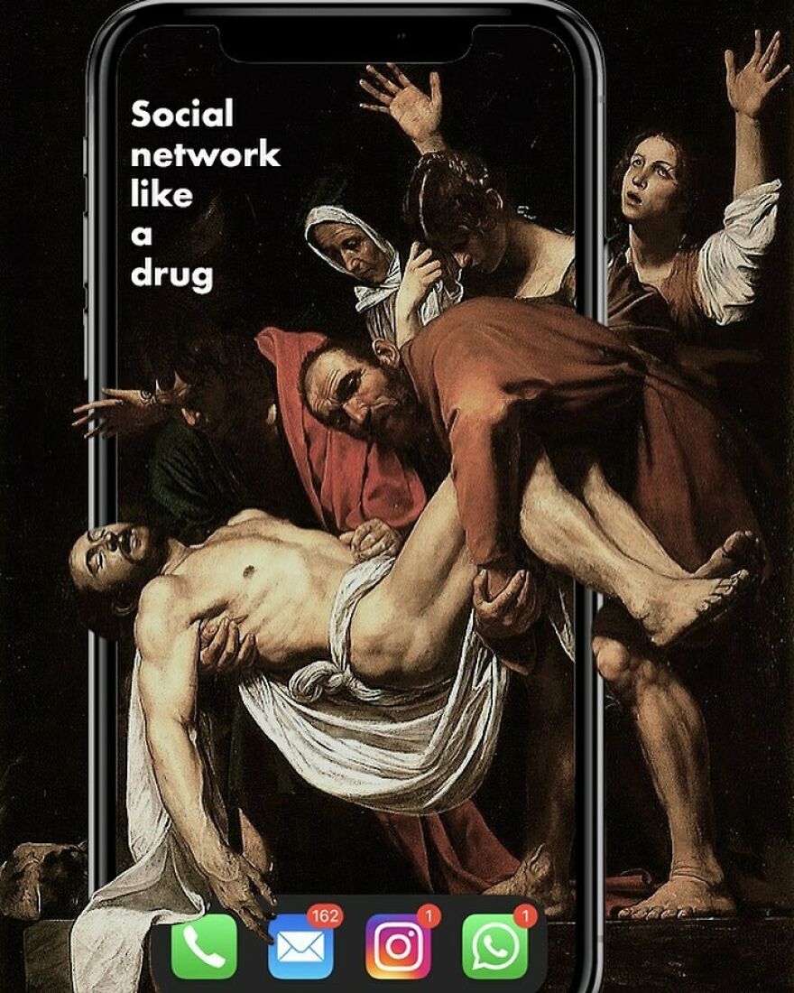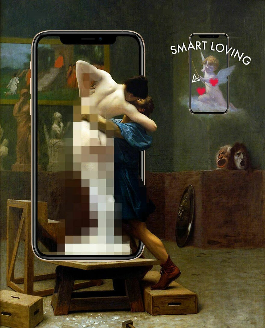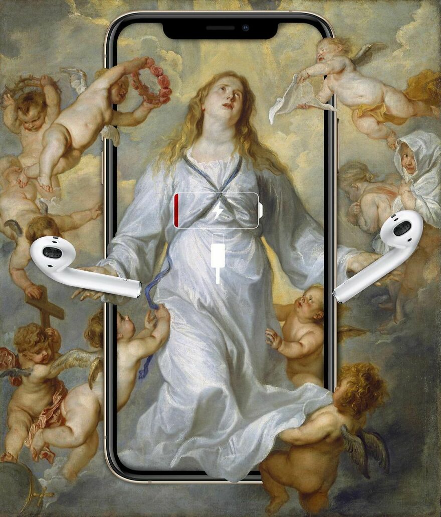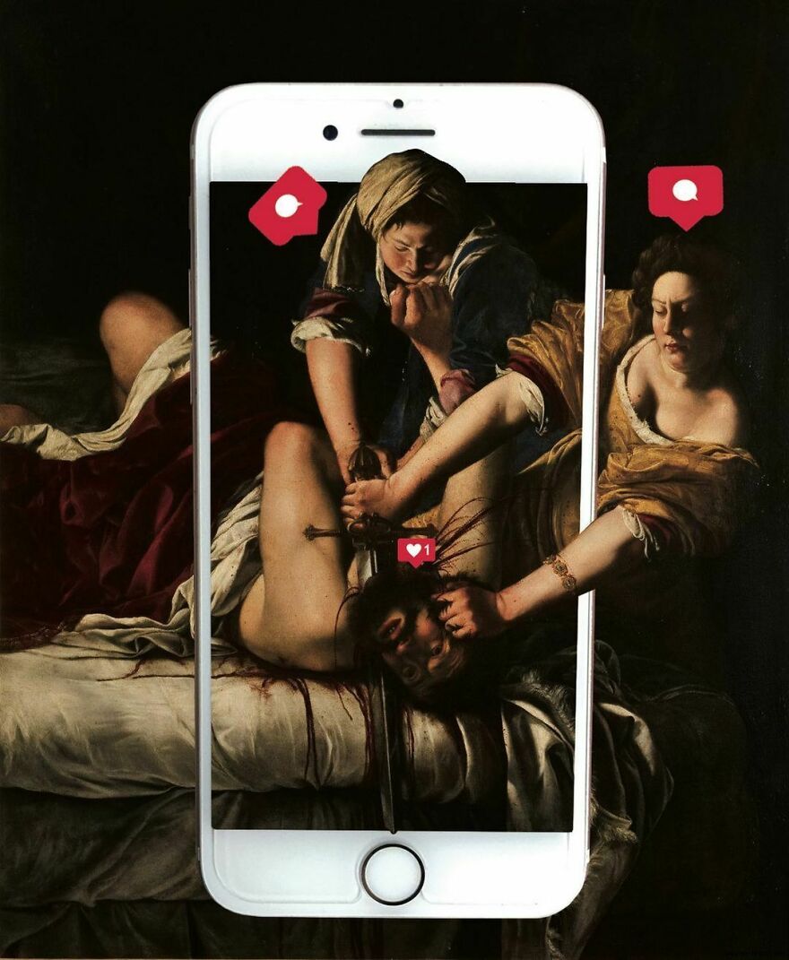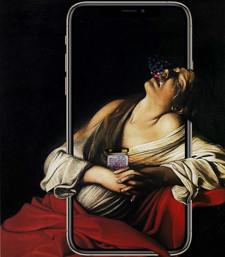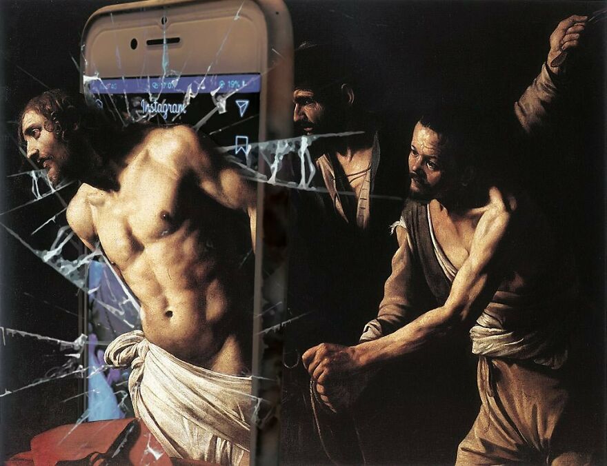 “My imagery was born as a critique of society, saturated with social, aesthetic canons, and appearances. This concept is reflected in my works that deal with social media as a new religion and a new creed. To express my intent, I take artworks from the past and re-contextualize them to the present day. In fact, in my works, the main character is a smartphone, my identifying mark,” the artist told Bored Panda.
