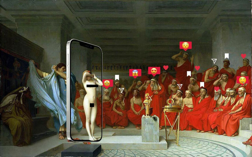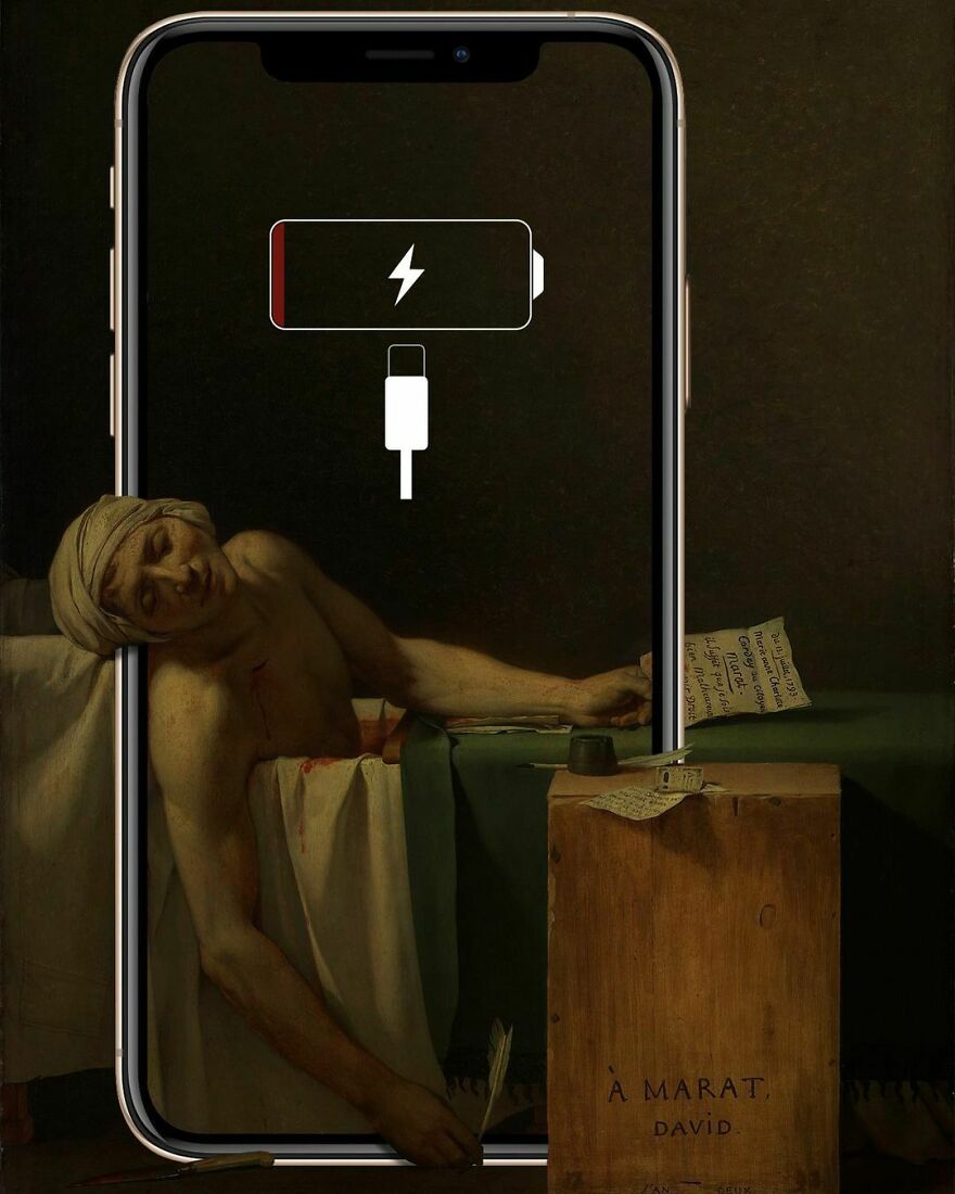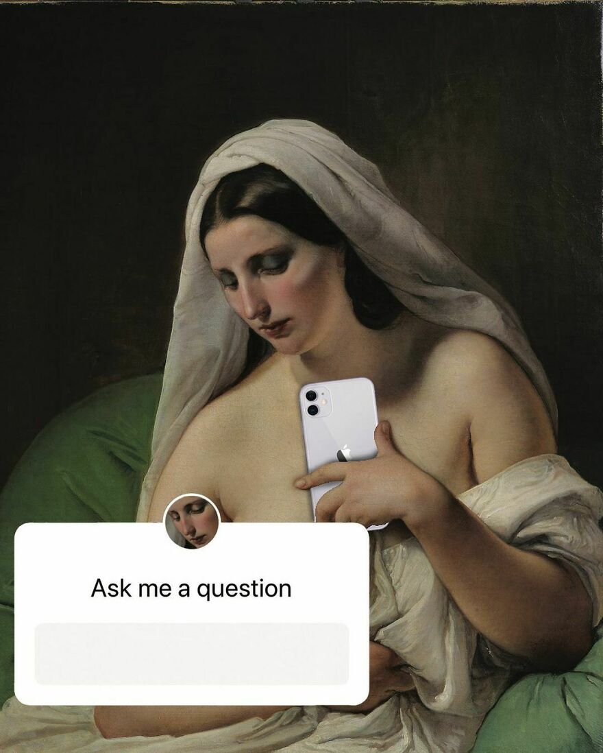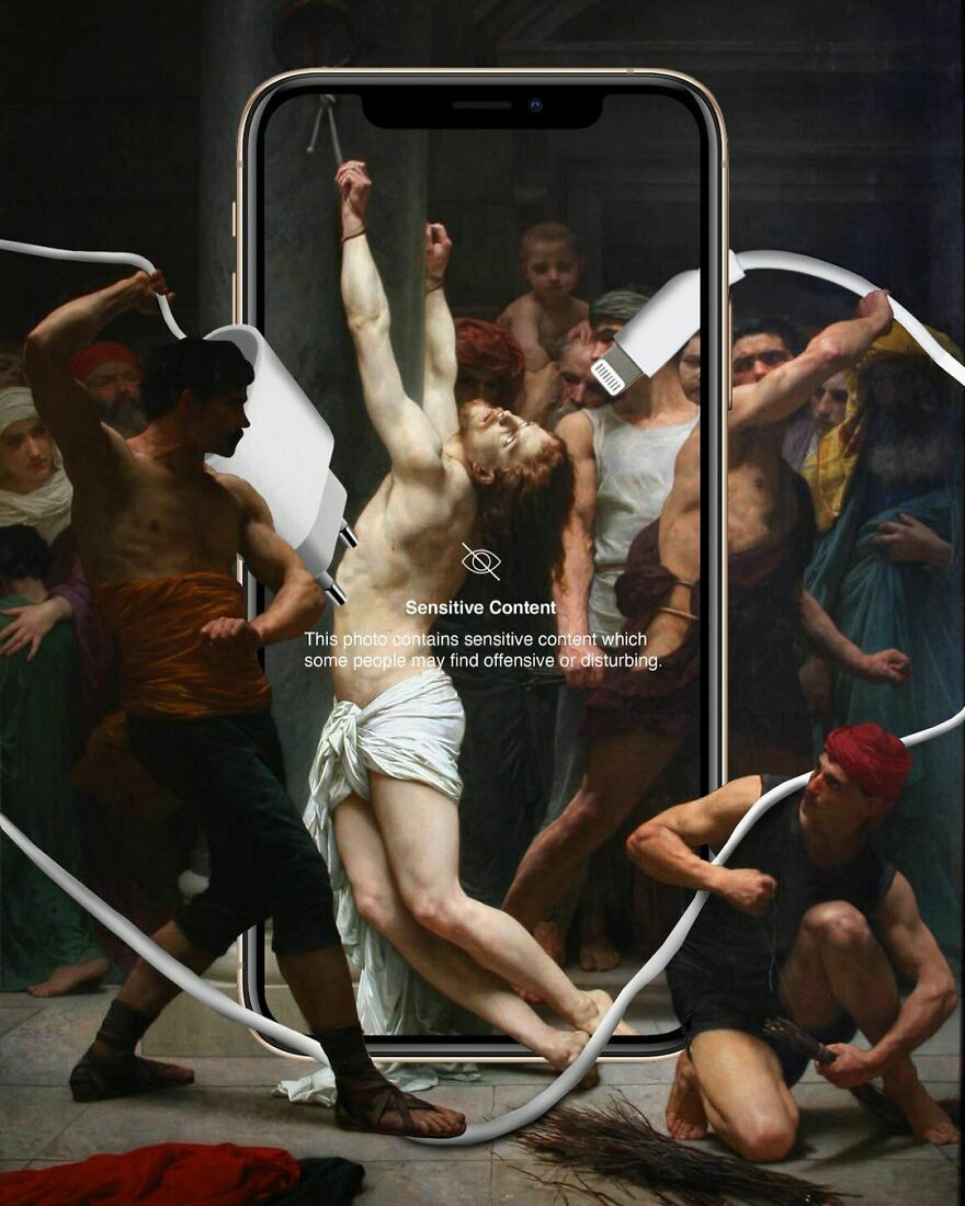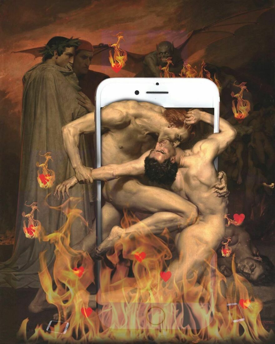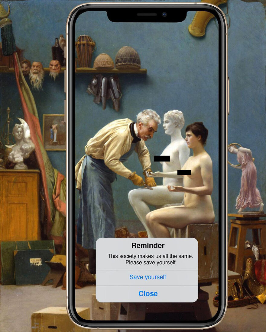 “My imagery was born as a critique of society, saturated with social, aesthetic canons, and appearances. This concept is reflected in my works that deal with social media as a new religion and a new creed. To express my intent, I take artworks from the past and re-contextualize them to the present day. In fact, in my works, the main character is a smartphone, my identifying mark,” the artist told Bored Panda.