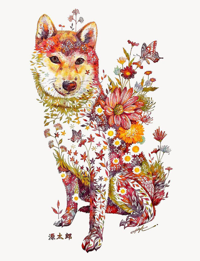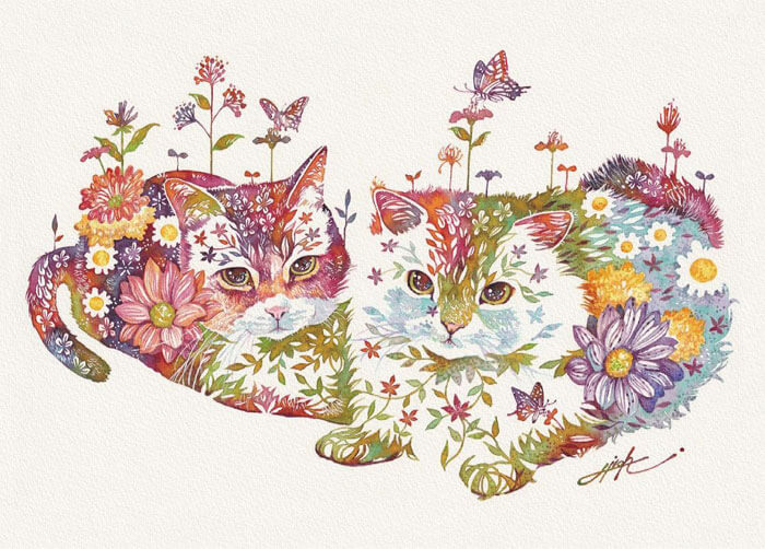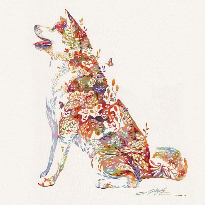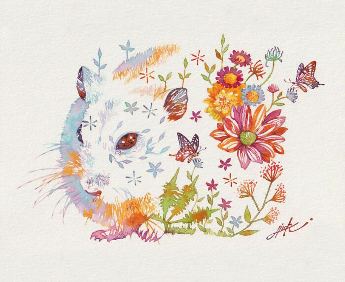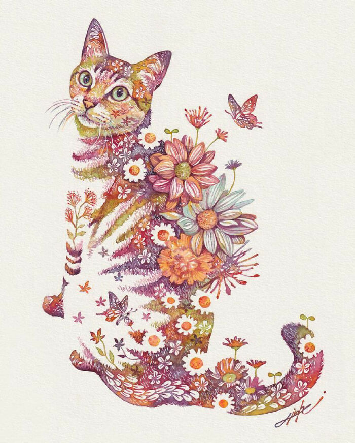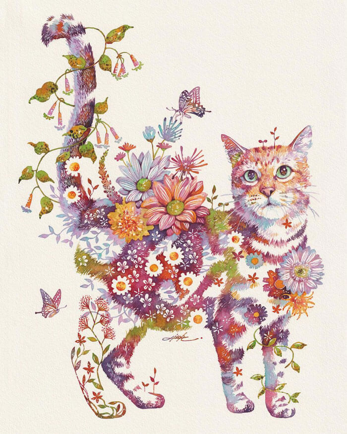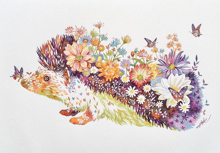 An artist from Japan, Hiroki Takeda, is recognised for his colorful watercolor paintings frequently depicting a variety of adorable animals composed from floral motifs. His way of painting is incredibly special and effortlessly recognizable, so take pleasure in the attractive fusion of flora and fauna that is depicted in his art.