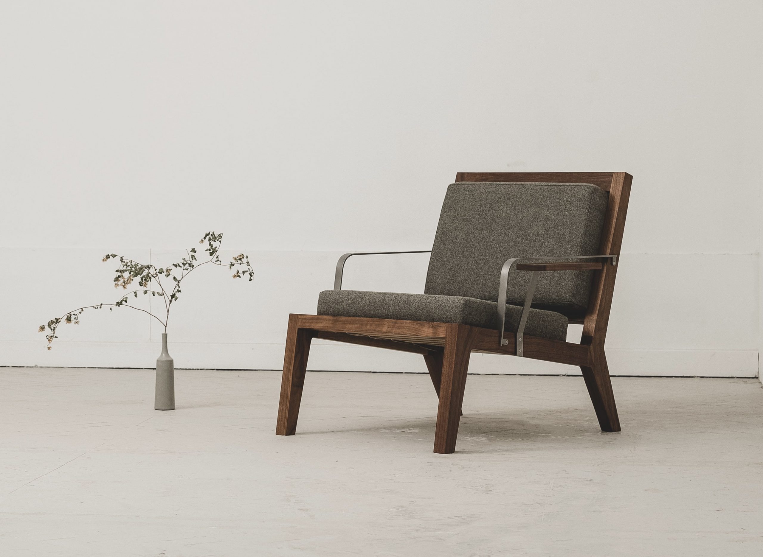 the users’ needs,” explains the studio. The piece was designed in collaboration with Edinburgh-based craftsman and furniture maker Namon Gaston, as an “intriguing focal point in the neutral environment of [the studio’s] store.”Also featured is the Lounge Chairs, which were built in collaboration with furniture maker Lewis Macleod. Made to order in a highly limited edition, the chair can be specified in either American Walnut or Scottish Oak. Three divergent textiles options are available; grey Melton wool, tan calf leather, or forest green Italian bouclé, the latter of which the studio says evokes the mid-century aesthetic of Charlotte Perriand and Jean Prouvé. “The most striking feature is subtle: a small removable plinth extending on a stainless steel arm, bolted to the left hand side of each chair,” the studio continues. “Its bevelled hardwood top is large enough for a coffee cup or book and neatly adds an additional level of functionality, something which runs through much of our work.”