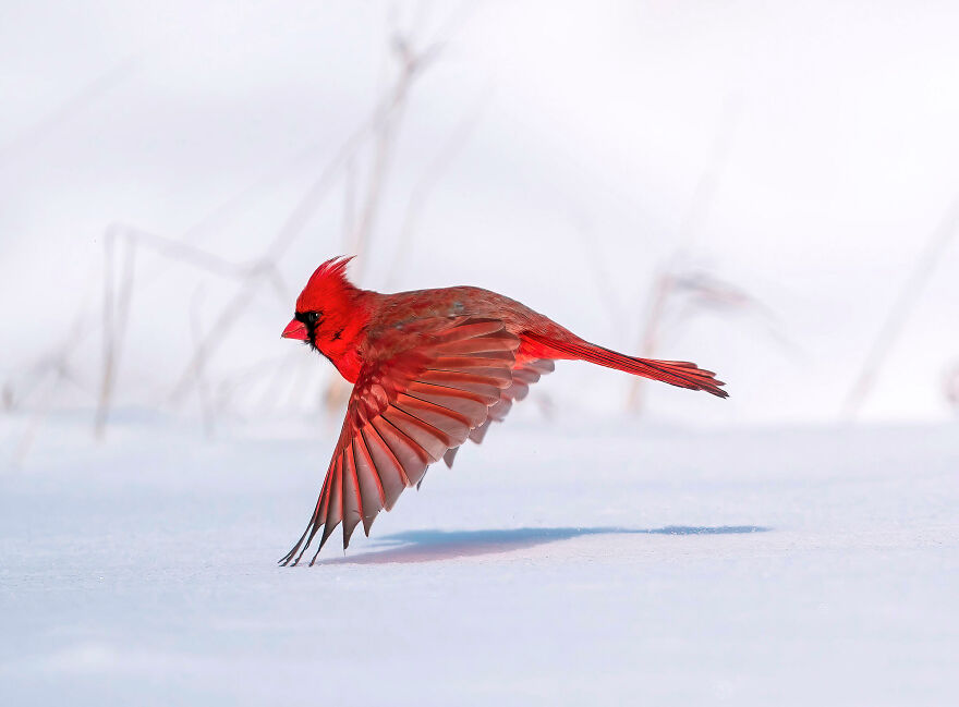 Story Powering the Shot: On a bitterly chilly wintertime working day I went searching for eagles and Snowy Owls in rural Michigan. Cruising side streets, I found a Rough-legged Hawk perched atop a pine tree, but all I captured was its tail as it flew absent. It was then that I spotted a male Northern Cardinal traveling from plant to plant, feeding on the seeds, his crimson feathers reflected in the vibrant white snow flecked with ice crystals. I took the first shot when he took flight. By the next frame, the striking songbird was absent.