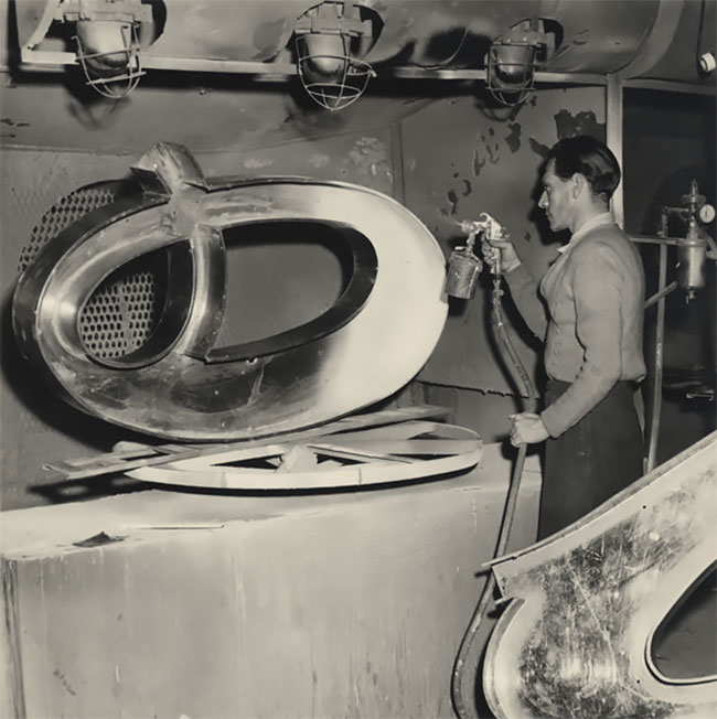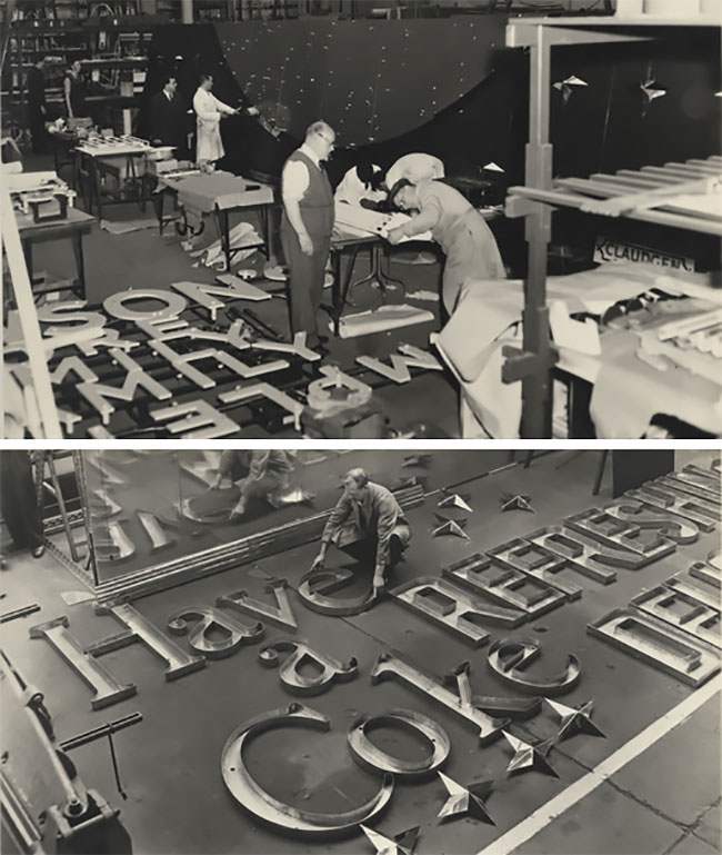 Photographs present sheet metallic getting minimize, staff painting the metal and putting in the neon tubing. On web page, scaffolding rose into the air as employees installed the indicator in big sections until finally the last piece was positioned and the indicator was lit.