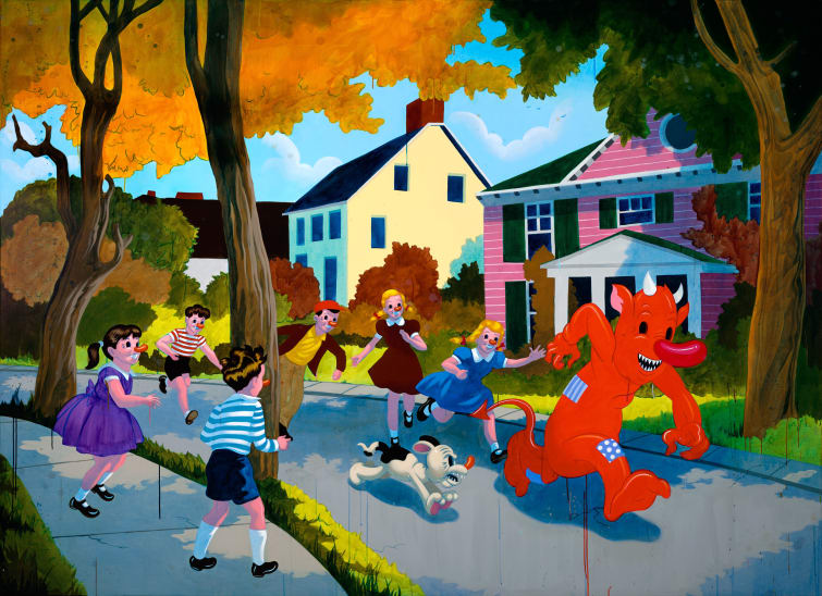 Victor is known for telling stories in his paintings. As if it were a contemporary chronicle, his work often appropriates the narrative logic of illustrations for children’s stories, and the aesthetics of classic animations, to present us with humorous fables about human nature and the state of society.