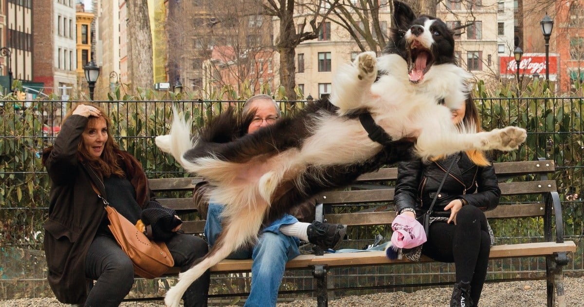 “In March 2019 I was sat in the Union Sq New York dog run when I spotted a lady with a pink bag on her hand (to keep her hand clean) throwing a ball to her dog which was sat down facing her. The dog then launched itself and flipped in mid air to face me and snap! As you can see the lady with her hand on her head was as surprised as me and I think she is saying phew! I have searched in vain via the NY media to find the owner so that I can send her a copy. No joy so I am hoping this Pet Comedy competition can help me find the mystery woman and her leaping dog. You never know!”