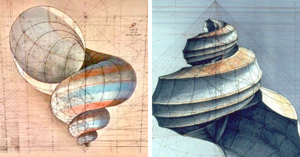 Artist Rafael Araujo expresses his like of mother nature by geometry. Incorporating the golden spiral and helixes into his compositions, he takes advantage of these concepts as the basis for shells and kaleidoscopes of butterflies. The benefits are drawings in which the pure aspects are sketched and colored in while the geometric guiding traces are left on the web page.