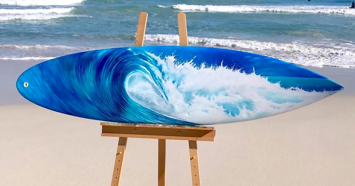 Australian artist Claire Marie is “reducing the selection of outdated surfboards that conclude up in a landfill, a single artwork at a time.” Her sustainable artistic follow uses discarded fiberglass surfboards as canvases for outstanding paintings of the ocean.