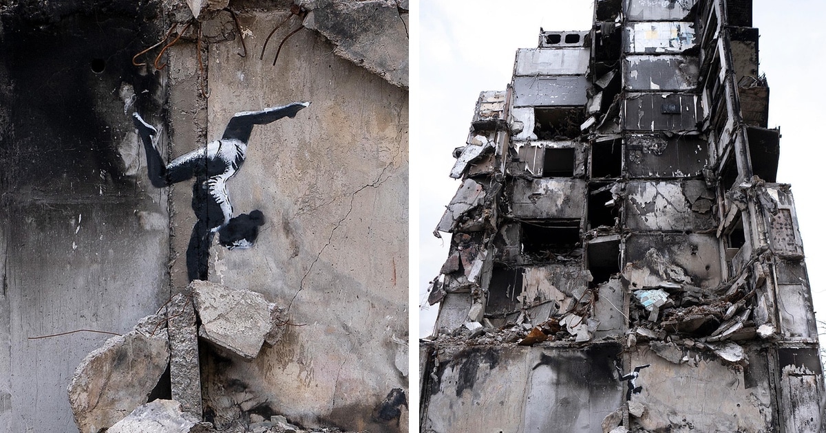 Banksy captioned the picture “Borodyanka, Ukraine.” Borodyanka, positioned about 30 miles northwest of Kyiv, was seriously bombarded by Russian troops in the early days of the war. Banksy’s photographs clearly show a pulled-back perspective of the piece to give a perception of the genuine wreckage it truly is surrounded by.