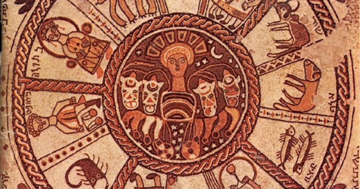 A 6th century mosaic zodiac wheel in a synagogue in Beit Alpha, Israel, incorporating Greek-Byzantine features. (Image: Wikimedia Commons, Community domain)
