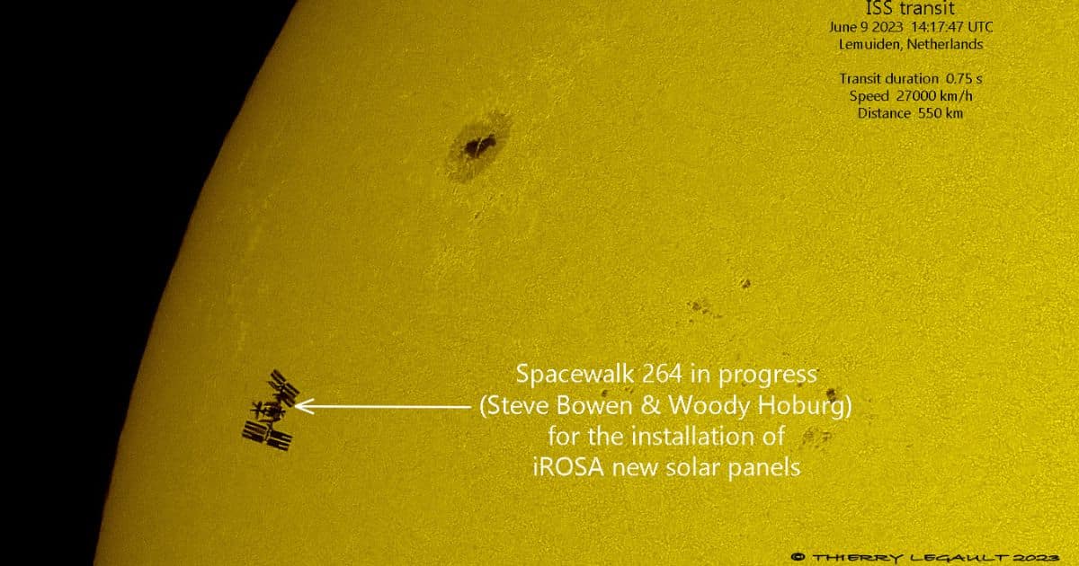 Not only did he seize the spacewalk, but his pictures exhibit the ISS passing by sunspots.