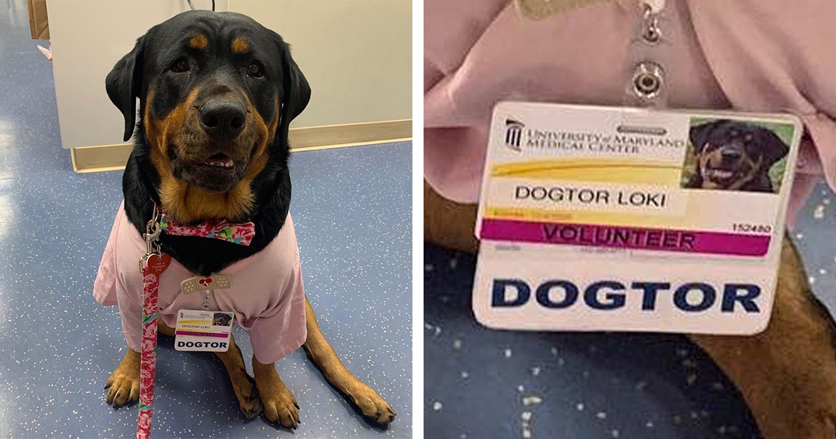 Loki the Rottweiler, a company therapy dog, was specified an honorary “Dogtorate” of Drugs by the College of Maryland Baltimore for her tricky work.