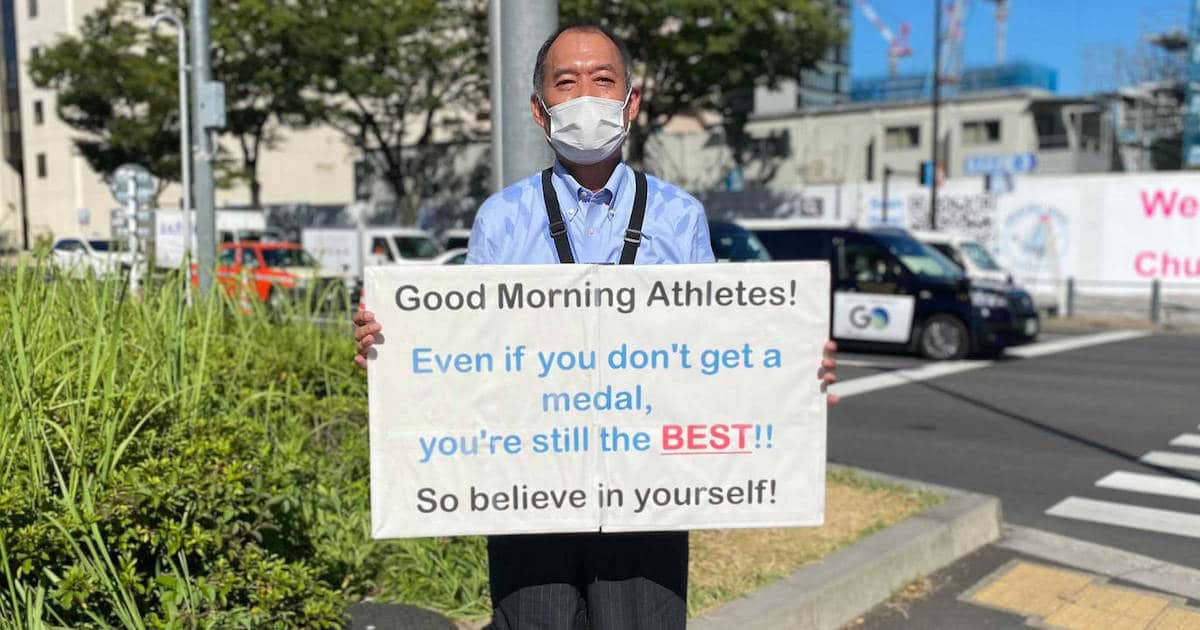 This gentleman stood outdoors the Tokyo Olympic Village just about every working day and held a motivational poster with encouraging text for the athletes.