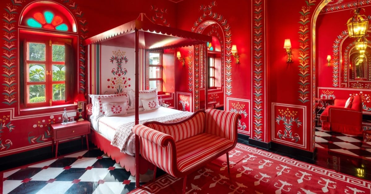In phrases of aesthetics, Villa Palladio Jaipur brings together European and Indian sensibilities. The white exterior is accented with pops of red the coloration provides a by way of line, as the interiors are painted in diverse shades ranging from deep crimson to cherry pink. And, in maintaining with Jaipur’s popularity as the Pink Town, pink accents pop up throughout the villa. Black and white checkboard floors give a distinction to the floral motifs painted on the partitions, giving the room an eclectic, retro feel that is reminiscent of a 19th-century “Grand Hotel.”
